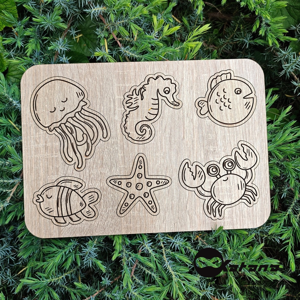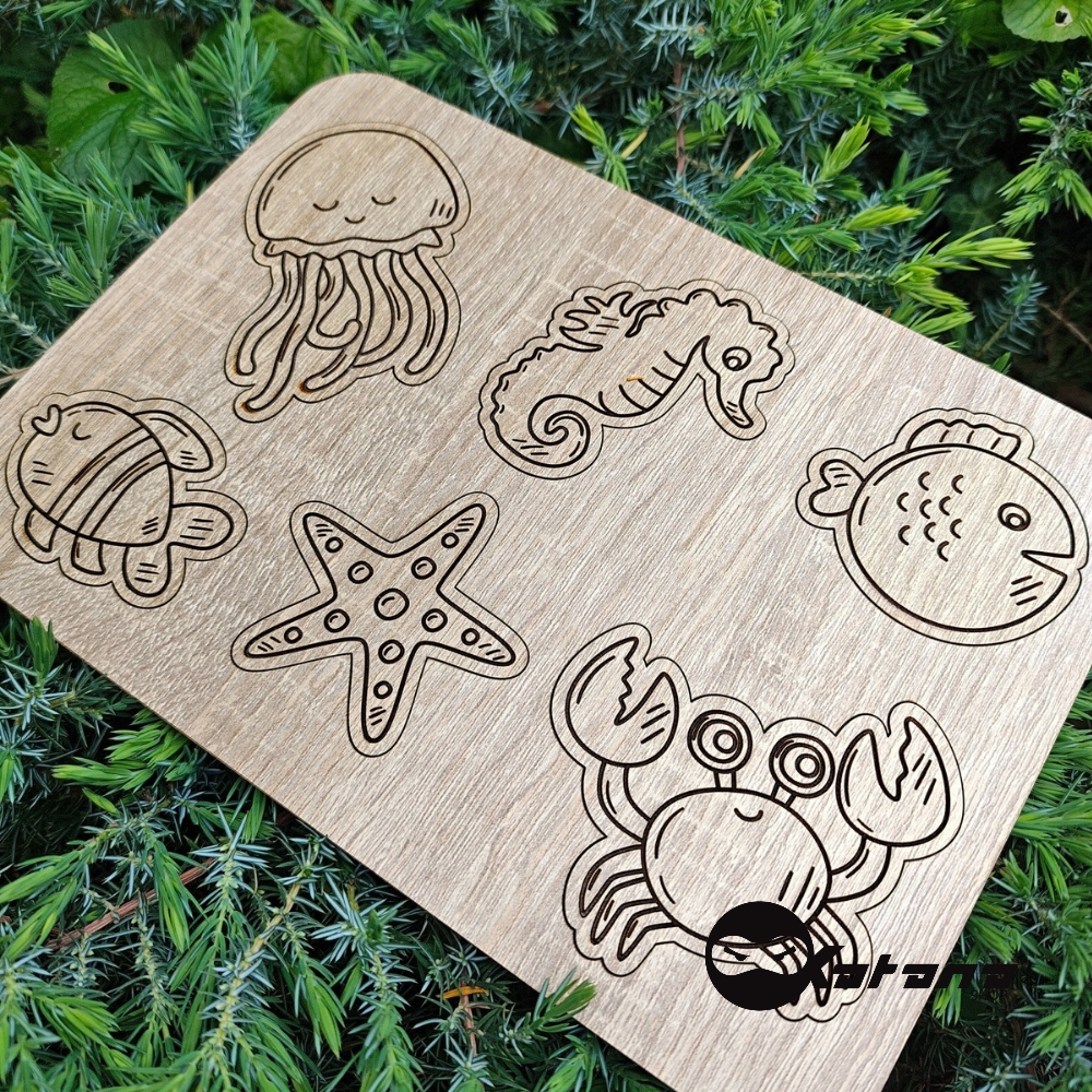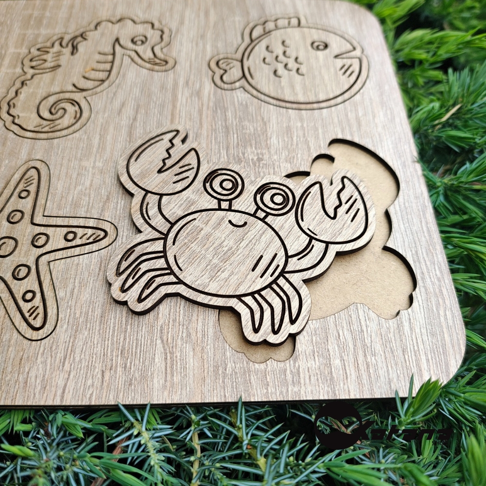 Simpatična slagalica za decu sa motivima iz morskog sveta, izrađena u potpunosti od prirodnog materijala.